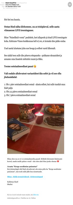 Paku oma uudiskirjaga liitunutele põnevust, saates neile tavapärasest erineva e-kirja. Proovi varieerida kujundatud e-posti lihttekstiliste e-kirjadega. Paljud meiliturundajad on 2021. aastaks juba minimalistliku suuna valinud. Publiku soosing selle trendi suhtes on tugev ja puhas, hästi struktureeritud e-kiri konkreetse sõnumiga saab järgnevate aastate populaarseimaks valikuks.
