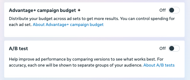 - A/B test. Soovi korral saad siin aktiveerida A/B testi, et võrrelda erinevaid sihtgruppe või reklaame ja leida see, mis kõige paremini toimib.