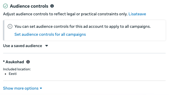 Kui sul on olemas laiem sihtrühm, võid omakorda reklaamis seda piirata – näiteks kui sul on seadistatud sihtrühm kõigi Tallinna elanike jaoks, siis saad konkreetses reklaamis piirata, et näitad seda vaid e-poodidest ostmise vastu huvi tundnud isikutele vanuses 25-45.