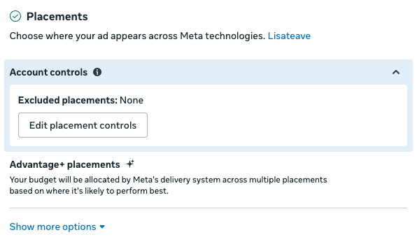 - Manual Placements: Saad ise valida täpsed kohad, kus sinu reklaam Metas ilmub. Näiteks saad valida, et reklaam jookseb ainult Instagrami Storydes.