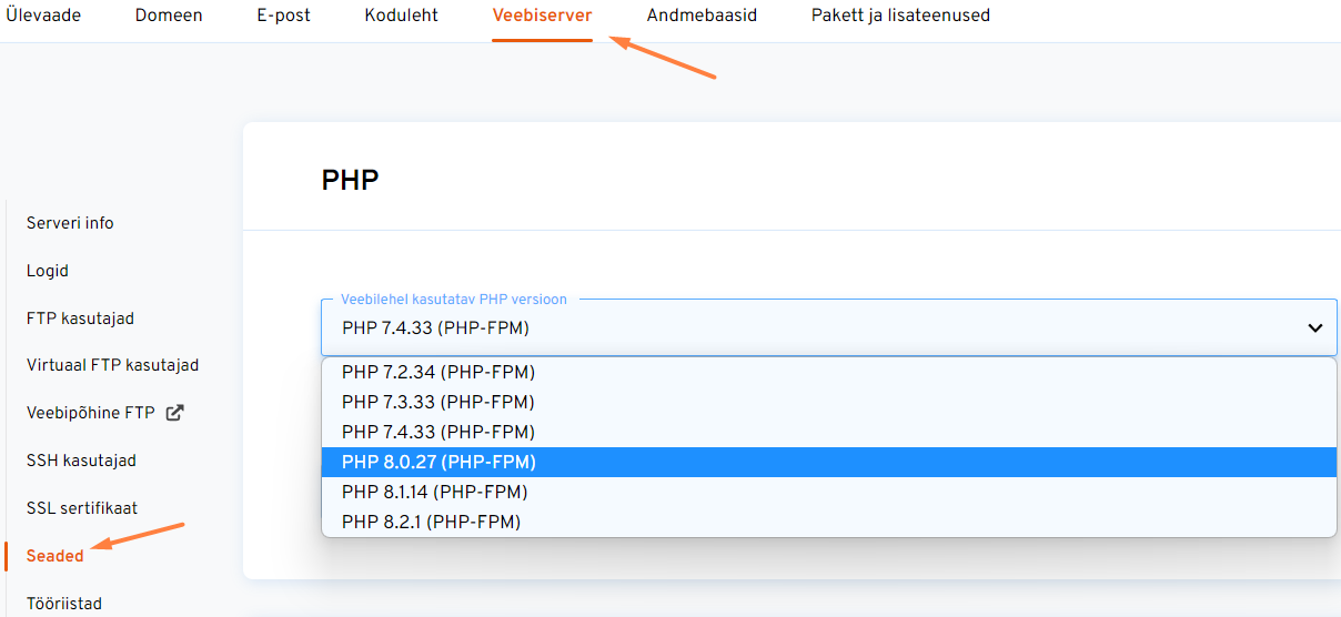 Jätka valikuga "Veebiserver" ⇒ "Seaded" ⇒ "Veebilehel kasutatav PHP versioon". Vali avanevast rippmenüüst soovitud PHP versioon.
